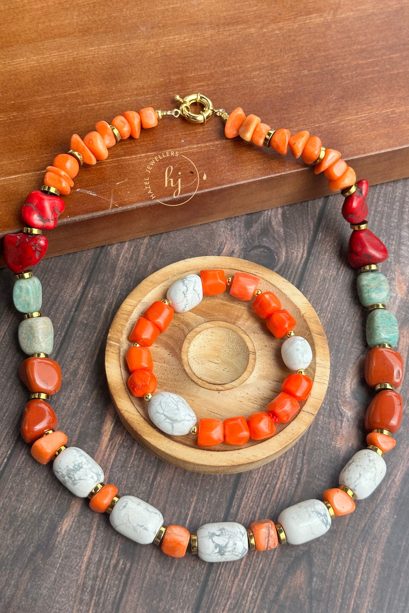 Coral bead and stone Necklace with bracelet
